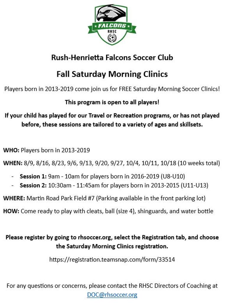Please join us for FREE Saturday Morning Clinics starting 8/16! This program is open to all players, in and out of our Club. More information is available on the attached flyer.